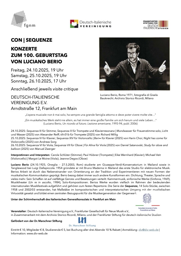 Die Serie der Sequenze, 14 Solo-Stücke, die zwischen 1958 und 2002/03 entstanden, hat Maßstäbe im kompositorischen und interpretatorischen Umgang mit der musikalischen Virtuosität gesetzt und bildet einen zentralen Bezugspunkt für die Musikergeneration der Gegenwart. In der Konzertreihe „Con | Sequenze“ werden sechs Sequenze (Stimme, Klavier, Viola, Oboe, Trompete, Violoncello) musikalische Reflexionen über die Entwicklung der Behandlung der Instrumente durch und seit Berio gegenübergestellt.